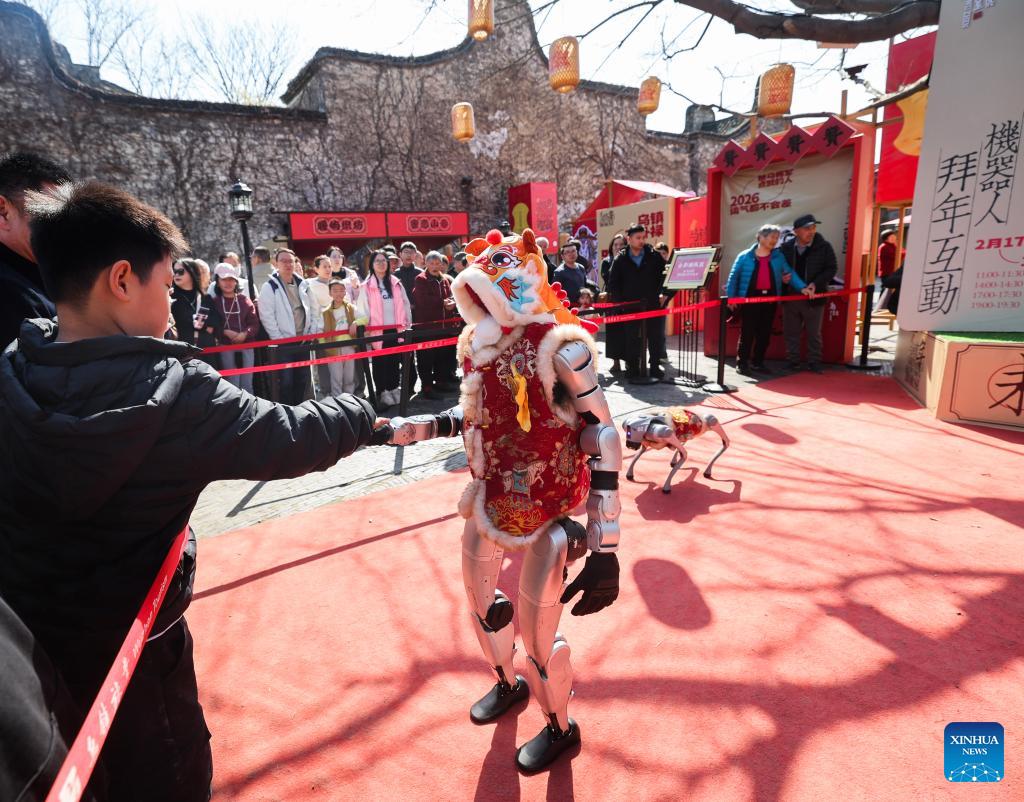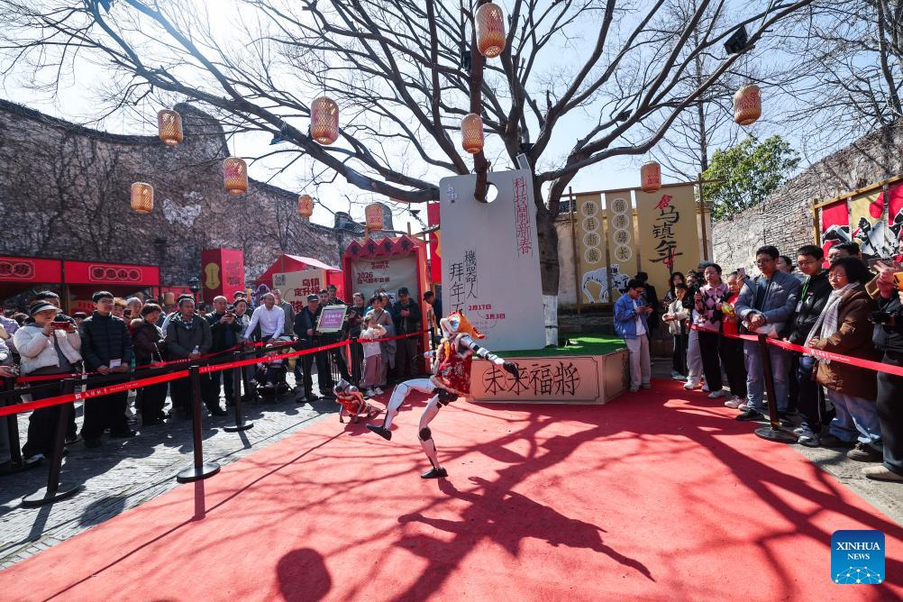 A robot performs in Wuzhen, Tongxiang City, east China's Zhejiang Province, Feb. 21, 2026. During this Spring Festival holiday, the ancient water town of Wuzhen launched over sixty activities which present the town's rich history and modern vitality reflected in folk customs, drama, science and technology, and culture. (Xinhua/Xu Yu)