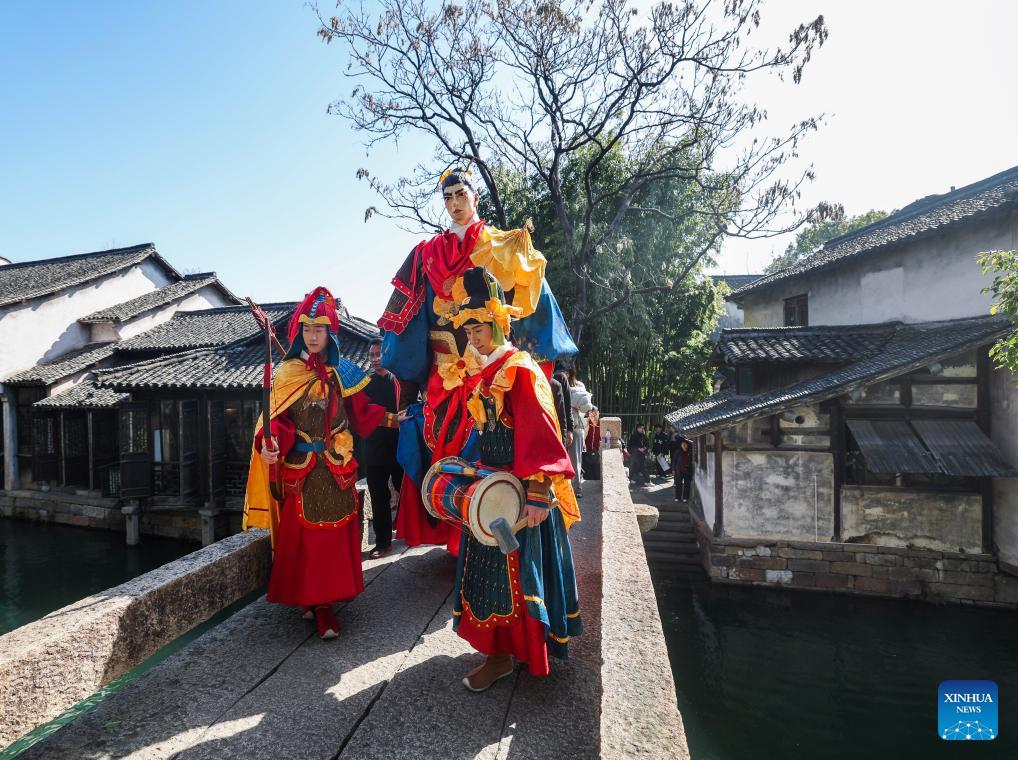 Artists perform during a parade in Wuzhen, Tongxiang City, east China's Zhejiang Province, Feb. 21, 2026. During this Spring Festival holiday, the ancient water town of Wuzhen launched over sixty activities which present the town's rich history and modern vitality reflected in folk customs, drama, science and technology, and culture. (Xinhua/Xu Yu)