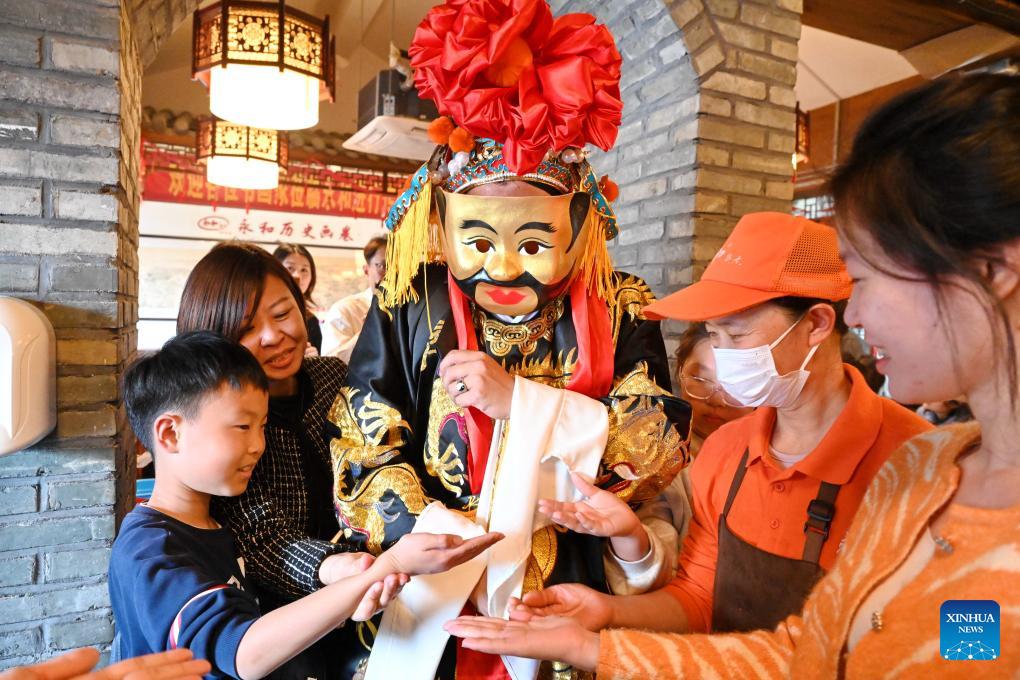 A staff member dressed as a "God of Wealth" (C) offers blessings to customers at a store in the historic and cultural city block Three Lanes and Seven Alleys in Fuzhou, southeast China's Fujian Province, Feb. 21, 2026. Folk events were held here on Saturday to receive the "Gods of Wealth," a tradition to celebrate the fifth day of the Chinese New Year, or the Spring Festival. (Xinhua/Lin Shanchuan)