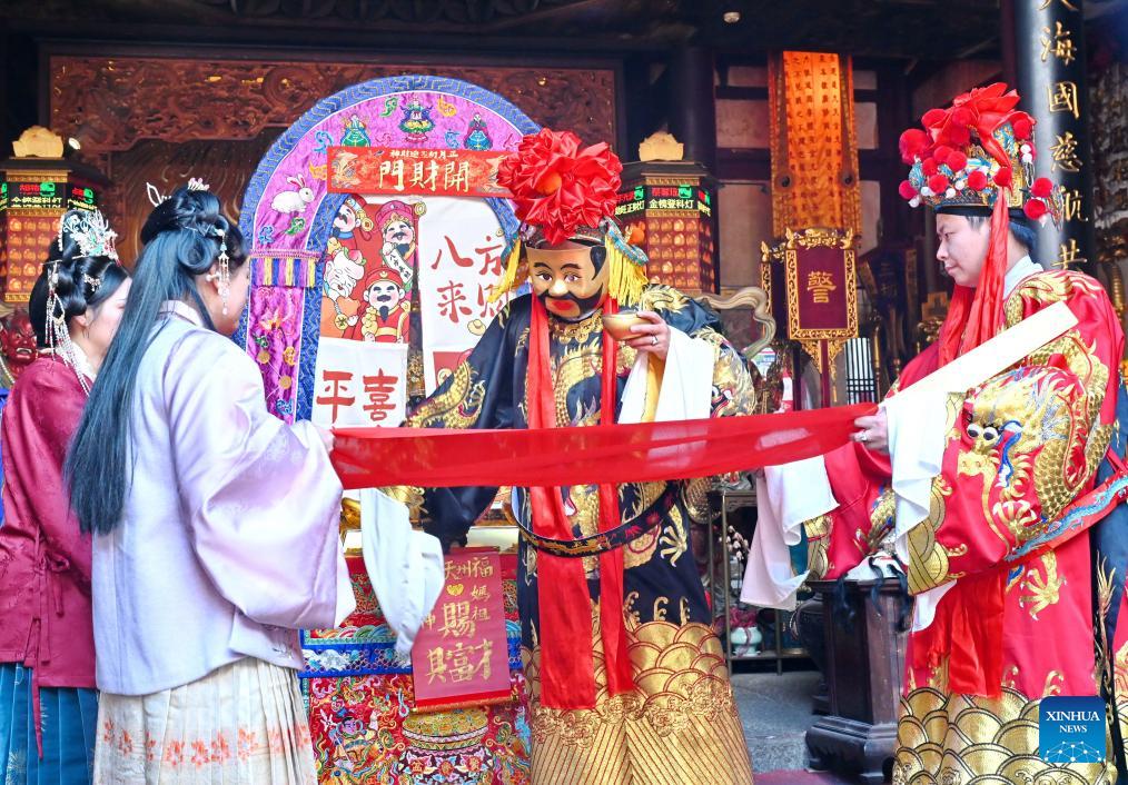 A folk activity to receive the "Gods of Wealth" is held at a traditional Chinese medicine clinic in the historic and cultural city block Three Lanes and Seven Alleys in Fuzhou, southeast China's Fujian Province, Feb. 21, 2026. Folk events were held here on Saturday to receive the "Gods of Wealth," a tradition to celebrate the fifth day of the Chinese New Year, or the Spring Festival. (Xinhua/Lin Shanchuan)