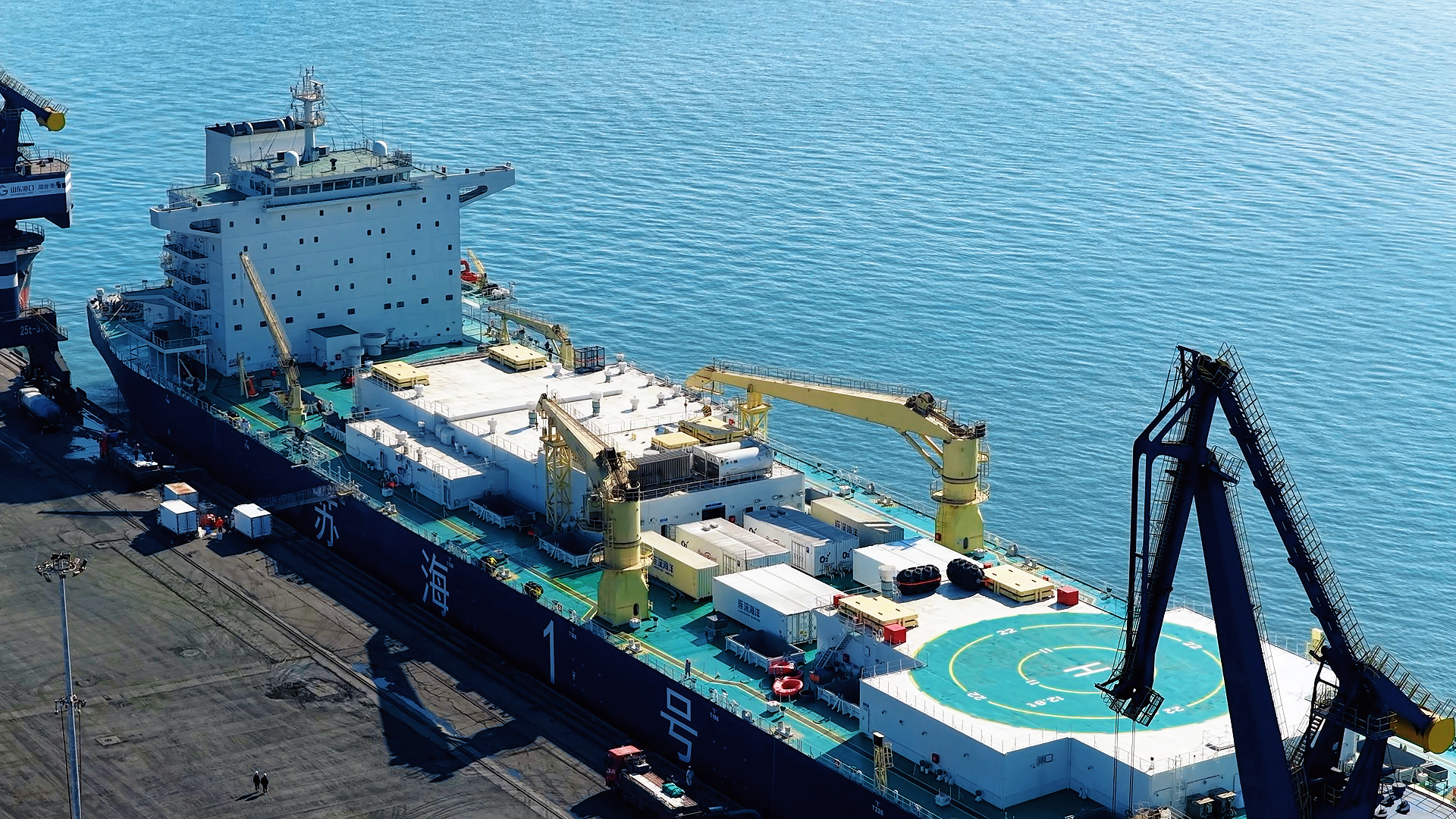 A view of Suhai-1, the world's first self-propelled enclosed salmon aquaculture vessel, Yantai, east China's Shandong Province, February 11, 2026. (Photo: CGTN)