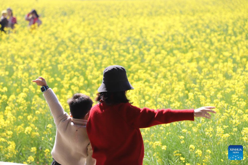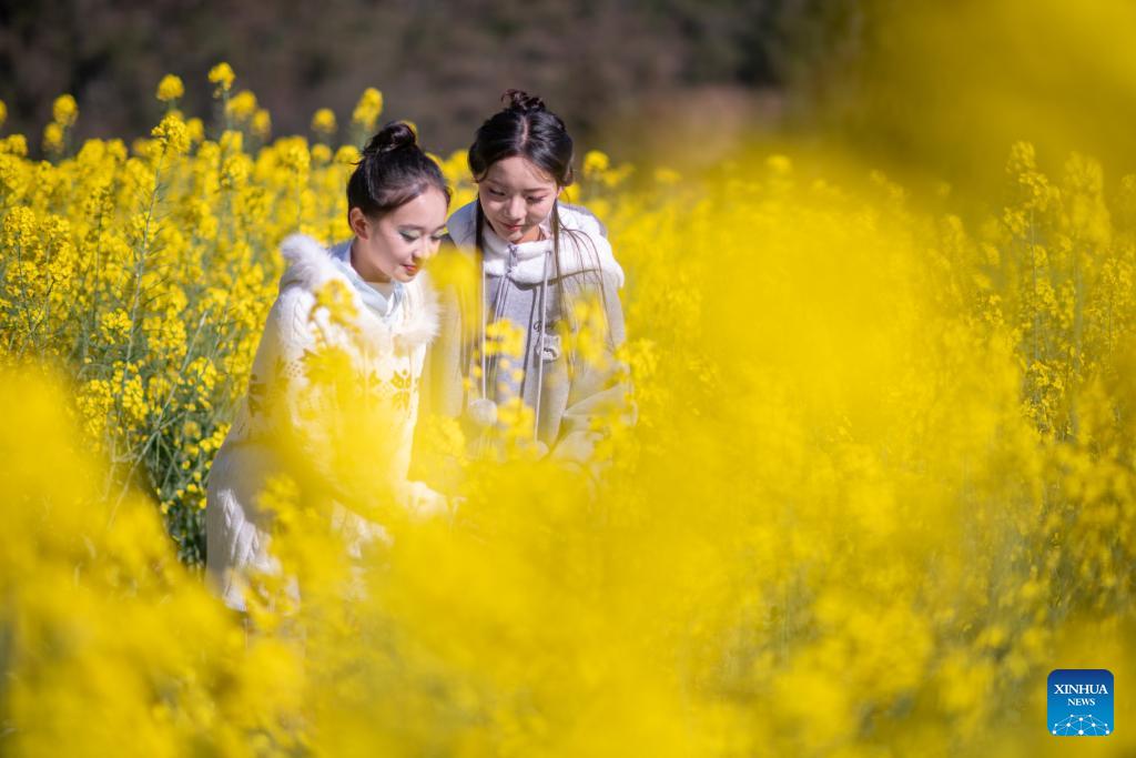 Tourists visit a rapeseed flower field in Tanba Village of Yusi Town, Luxian County, southwest China's Sichuan Province, Feb. 19, 2026. (Photo by Liu Xueyi/Xinhua)
