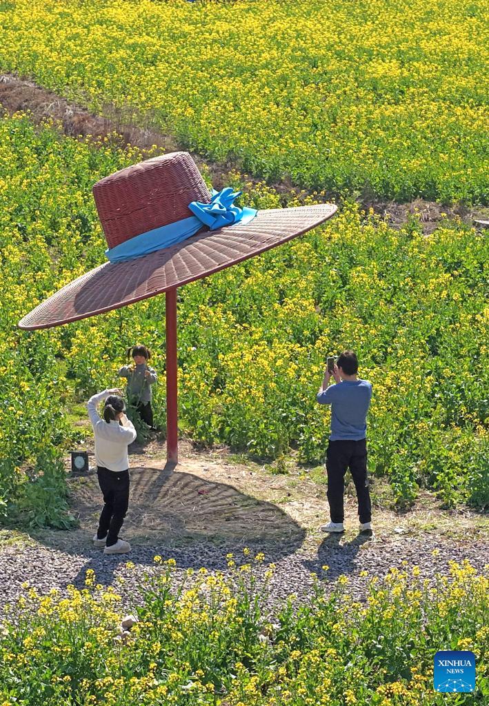Tourists visit a rapeseed flower field in Songjian Village of Songmen Town, Wenling City, east China's Zhejiang Province, Feb. 21, 2026. (Photo by Jiang Wenhui/Xinhua)
