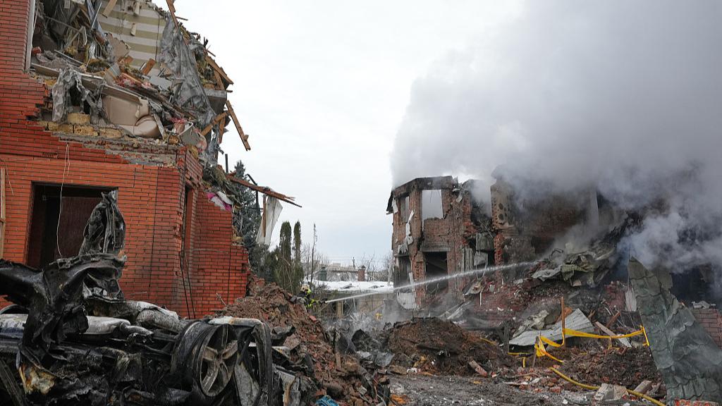 Emergency services personnel work to extinguish a fire following a Russian attack in Kyiv, Ukraine, February 22, 2026. (Photo: VCG)