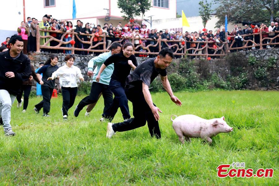 Photo released on Feb. 24, 2026 shows contestants take part in a pig-catching competition during the 2026 at Dahua Zongba Festival in Dahua Yao Autonomous County in south China's Guangxi Zhuang Autonomous Region. (Photo provided to China News Service)