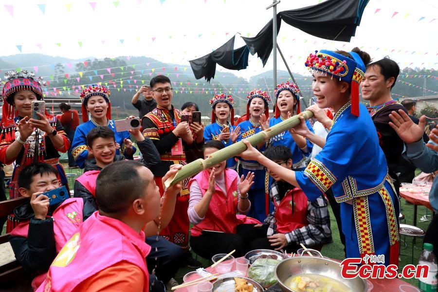 Photo released on Feb. 24, 2026 shows participants experience the traditional local toasting custom during the 2026 at Dahua Zongba Festival in Dahua Yao Autonomous County in south China's Guangxi Zhuang Autonomous Region. (Photo provided to China News Service)