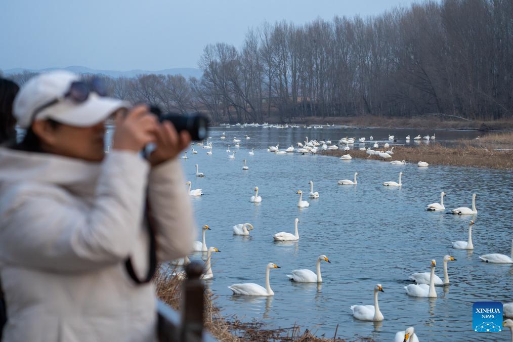 A tourist takes pictures of swans by the Daling River in Chaoyang City, northeast China's Liaoning Province, Feb. 25, 2026. Flocks of swans have migrated here since the beginning of winter, attracting many tourists. (Xinhua/Hu Jingwen)