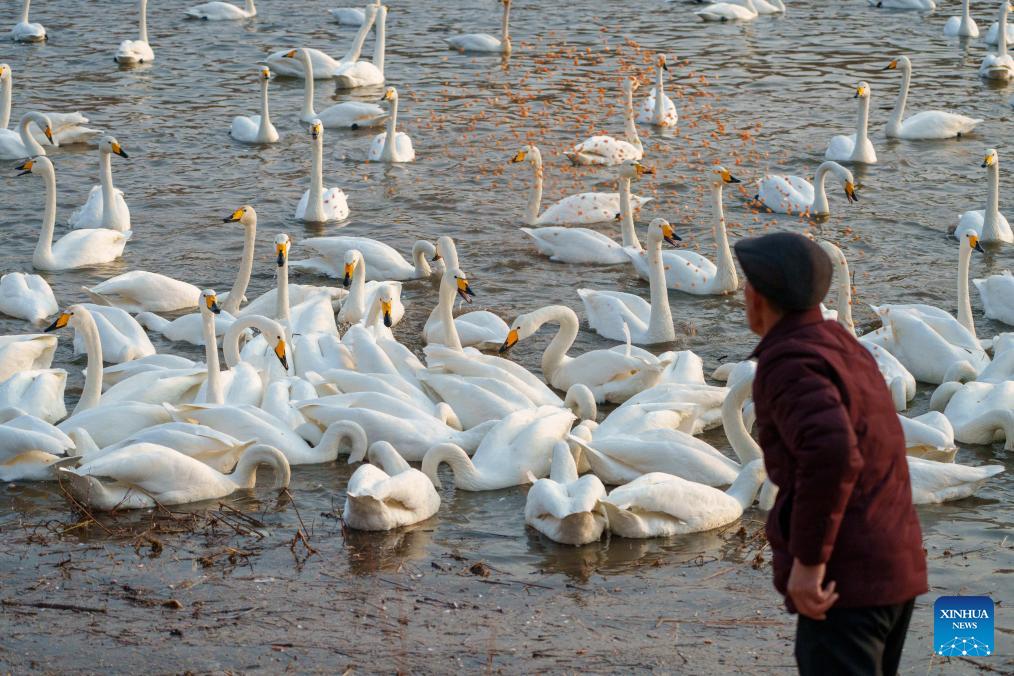 A man feeds swans by the Daling River in Chaoyang City, northeast China's Liaoning Province, Feb. 25, 2026. Flocks of swans have migrated here since the beginning of winter, attracting many tourists. (Xinhua/Hu Jingwen)