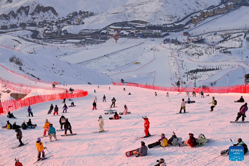 Ski enthusiasts enjoy a party around sunset at the Jiangjunshan International Ski Resort in Altay Prefecture, northwest China's Xinjiang Uygur Autonomous Region, Feb. 25, 2026. Following the Spring Festival holiday, major ski resorts in Altay continue to witness strong popularity and steady visitor flows. The Jiangjunshan International Ski Resort has welcomed an average of 12,800 visitors on a daily basis after the holiday, around 8,700 of whom would enjoy skiing here. (Xinhua/Wang Fei)