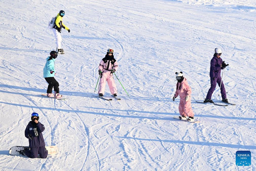 Ski enthusiasts are seen at the Jiangjunshan International Ski Resort in Altay Prefecture, northwest China's Xinjiang Uygur Autonomous Region, Feb. 25, 2026. Following the Spring Festival holiday, major ski resorts in Altay continue to witness strong popularity and steady visitor flows. The Jiangjunshan International Ski Resort has welcomed an average of 12,800 visitors on a daily basis after the holiday, around 8,700 of whom would enjoy skiing here. (Photo by Nurbek Nurman/Xinhua)