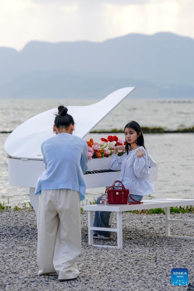 Tourists take photos on an installation beside the Dianchi Lake in Kunming City, southwest China's Yunnan Province, on Feb. 26, 2026. (Xinhua/Chen Xinbo)