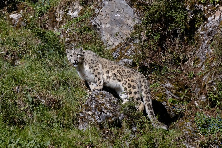 A snow leopard is pictured in Zadoi County of Yushu Tibetan Autonomous Prefecture, northwest China's Qinghai Province, Aug. 6, 2022. (Photo by Yao Muyang/Xinhua)