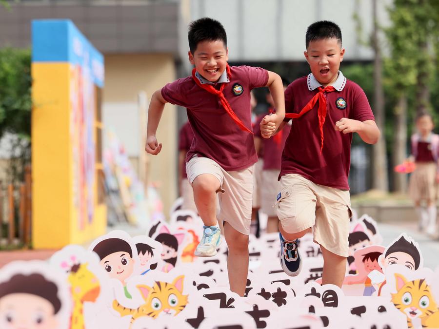 Photo shows students play an activity called "stepping towards the future" at a primary school in Anhui Province on Sept. 1, 2024. (Photo by Xie Chen/Xinhua)