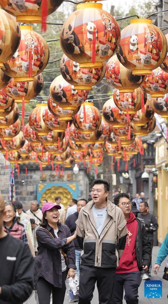 People stroll along a snack street at a temple fair at Wuhou Shrine in Chengdu, southwest China's Sichuan Province, Feb. 27, 2026. The temple fair is held here to mark the ongoing Spring Festival, or the Chinese New Year, which will end on the 15th day of the first lunar month. (Photo: Xinhua)