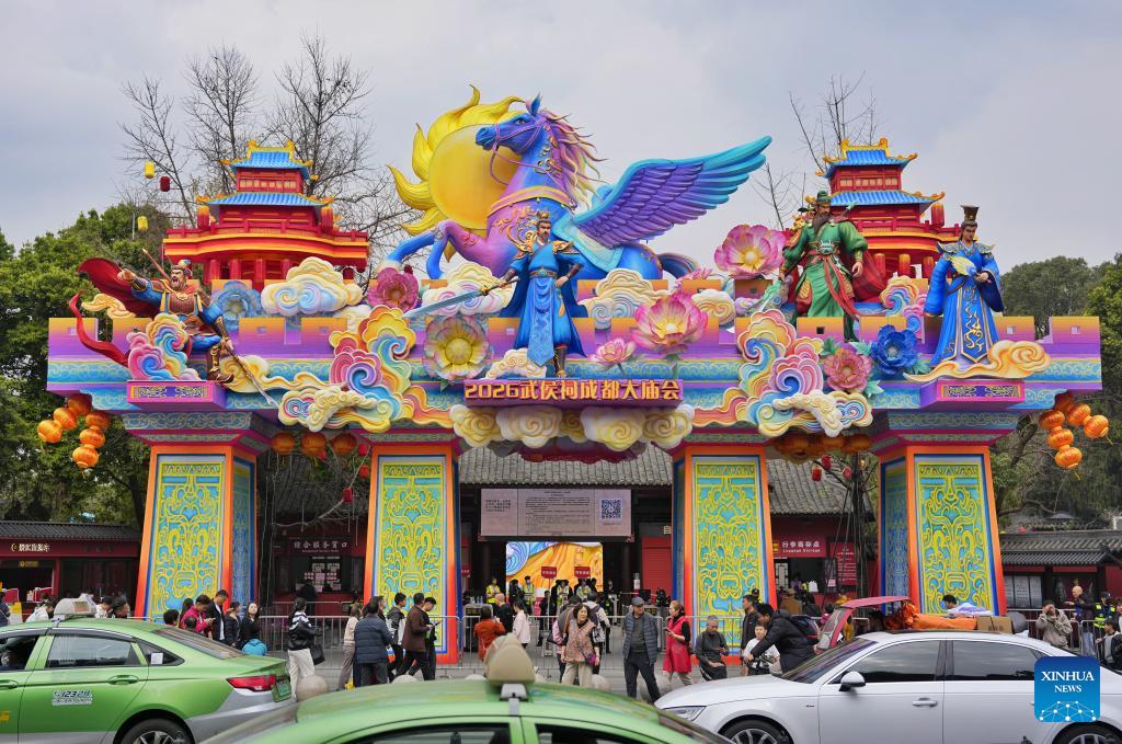 People visit a temple fair at Wuhou Shrine in Chengdu, southwest China's Sichuan Province, Feb. 27, 2026. The temple fair is held here to mark the ongoing Spring Festival, or the Chinese New Year, which will end on the 15th day of the first lunar month. (Photo: Xinhua)
