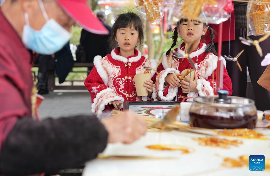 Children watch a syrup art craftsman working at a temple fair at Wuhou Shrine in Chengdu, southwest China's Sichuan Province, Feb. 27, 2026. The temple fair is held here to mark the ongoing Spring Festival, or the Chinese New Year, which will end on the 15th day of the first lunar month. (Photo: Xinhua)