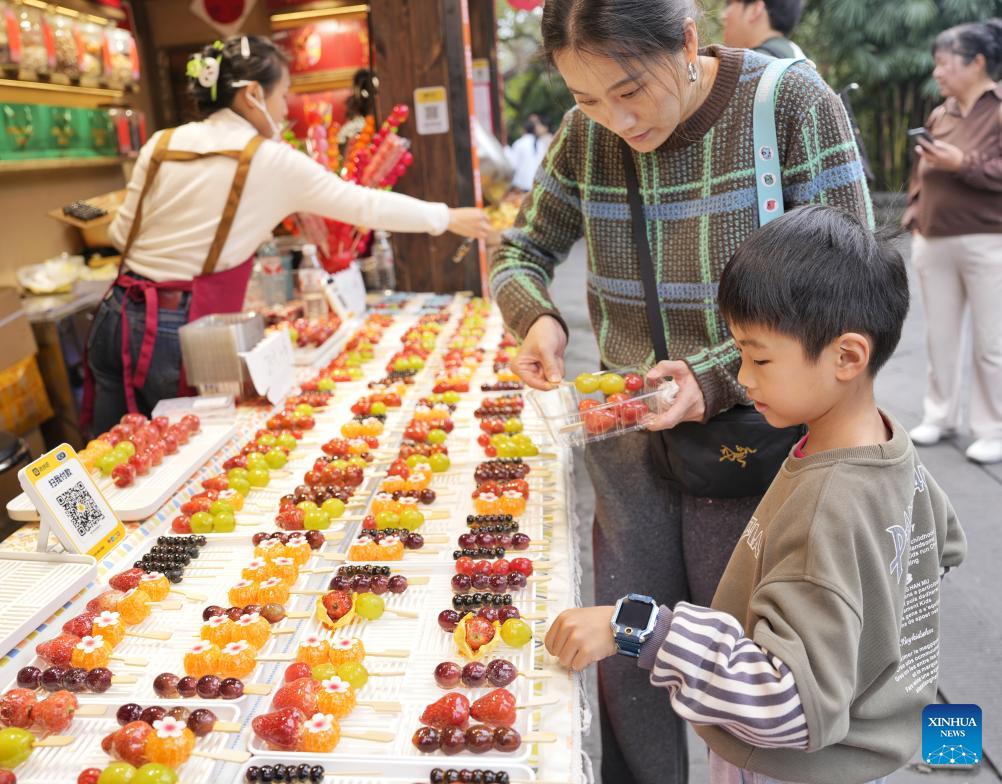 People select sugar-coated fruits at a temple fair at Wuhou Shrine in Chengdu, southwest China's Sichuan Province, Feb. 27, 2026. The temple fair is held here to mark the ongoing Spring Festival, or the Chinese New Year, which will end on the 15th day of the first lunar month. (Photo: Xinhua)