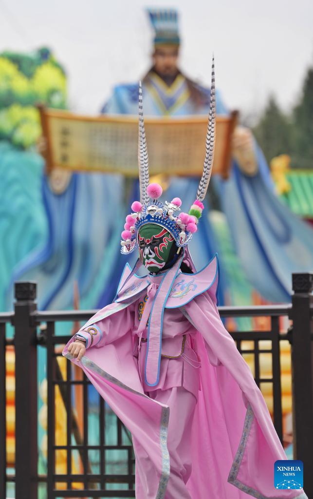 A child who has learnt face-changing stunt of Sichuan Opera poses for a photo during a temple fair at Wuhou Shrine in Chengdu, southwest China's Sichuan Province, Feb. 27, 2026. The temple fair is held here to mark the ongoing Spring Festival, or the Chinese New Year, which will end on the 15th day of the first lunar month. (Photo: Xinhua)