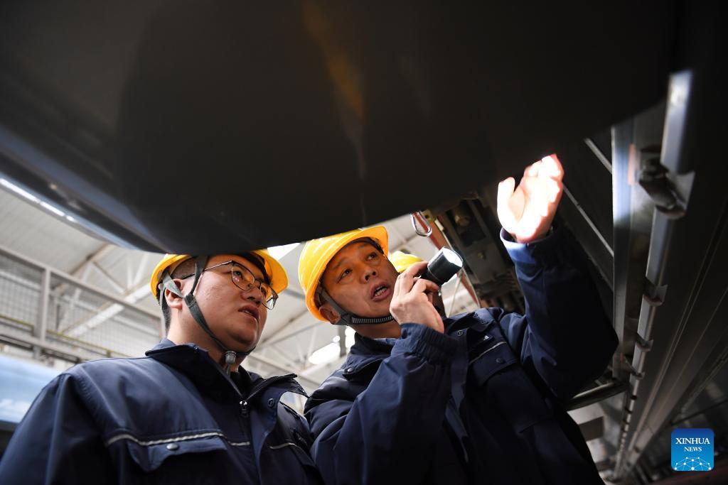 Dong Hongtao (R) and a colleague examine and maintain a bullet train at a maintenance depot of China Railway Xi'an Group Co., Ltd. in Xi'an, northwest China's Shaanxi Province, Jan. 14, 2026. (Photo: Xinhua)