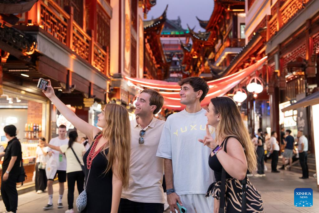 Tourists from Spain take a selfie at Yuyuan Garden Mall in Shanghai, east China, July 21, 2025. (Photo: Xinhua)