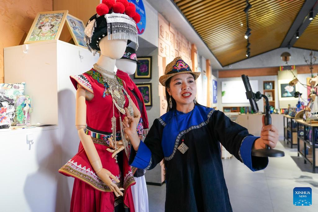 Jin Ruirui promotes Yi ethnic costumes featuring handmade embroidery via livestreaming at her studio in Mouding County, southwest China's Yunnan Province, Feb. 9, 2026. (Xinhua/Chen Xinbo)