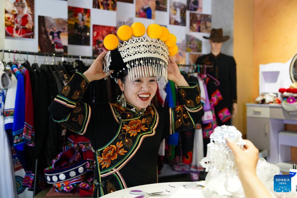 Jin Ruirui arranges her headwear at her studio in Mouding County, southwest China's Yunnan Province, Feb. 9, 2026. (Xinhua/Chen Xinbo)