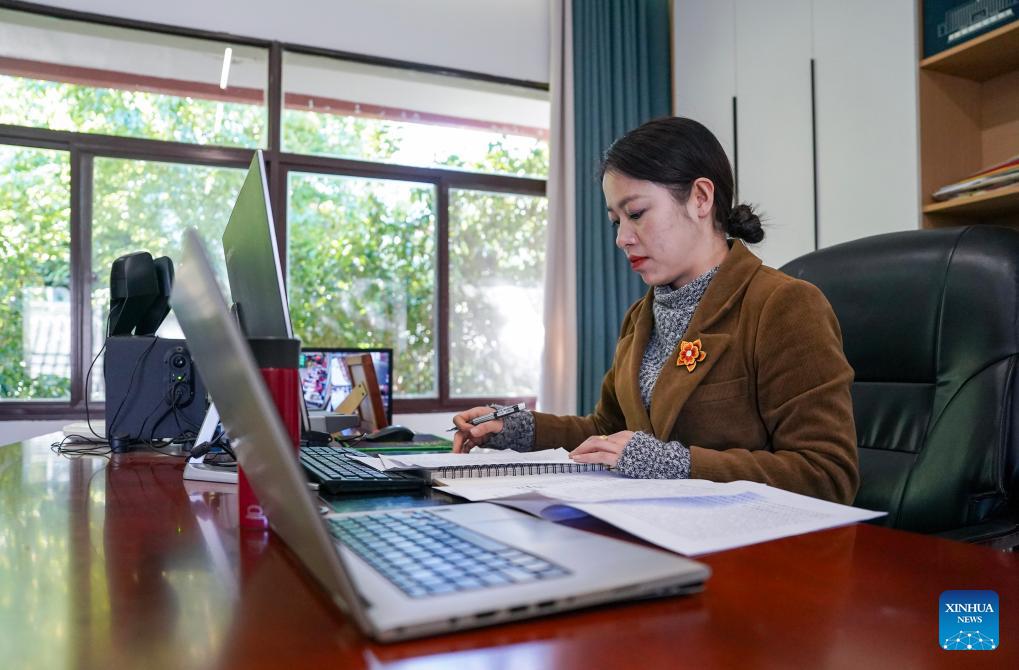 Jin Ruirui files suggestions at her office in Mouding County, southwest China's Yunnan Province, Feb. 9, 2026. (Xinhua/Chen Xinbo)