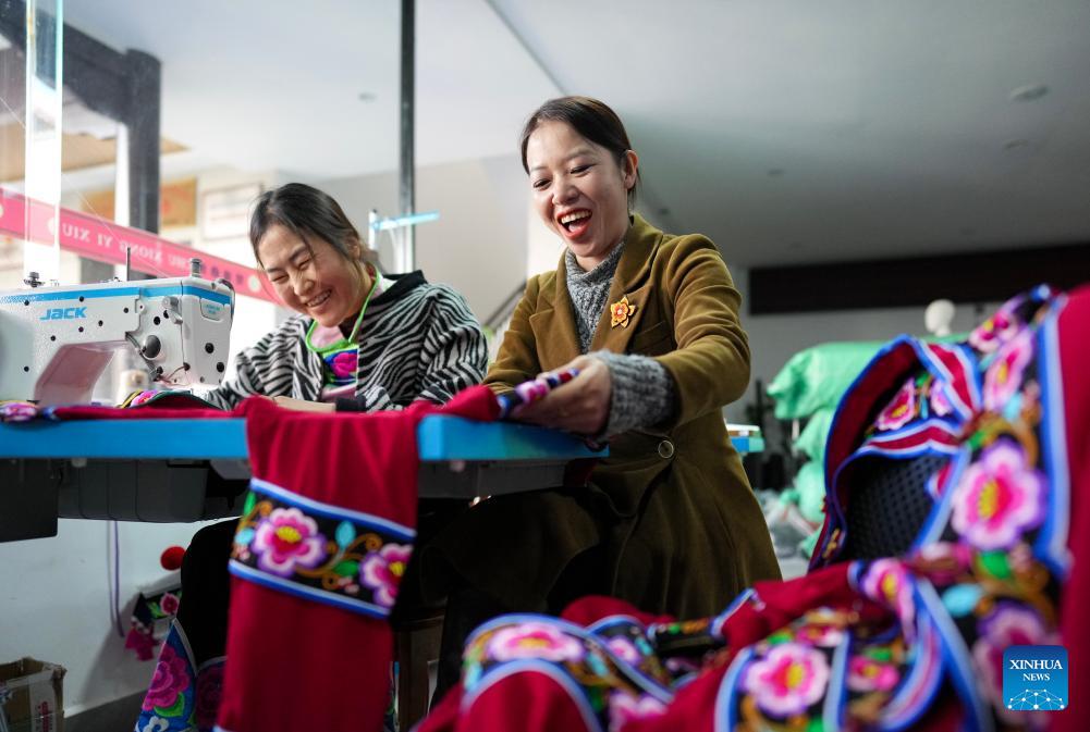 Jin Ruirui checks a piece of Yi ethnic costume featuring handmade embroidery at her studio in Mouding County, southwest China's Yunnan Province, Feb. 9, 2026. (Xinhua/Chen Xinbo)