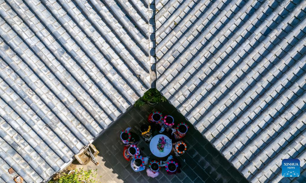 An aerial drone photo shows Jin Ruirui seeking suggestions from local embroiderers at her studio in Mouding County, southwest China's Yunnan Province, Feb. 9, 2026.(Xinhua/Chen Xinbo)
