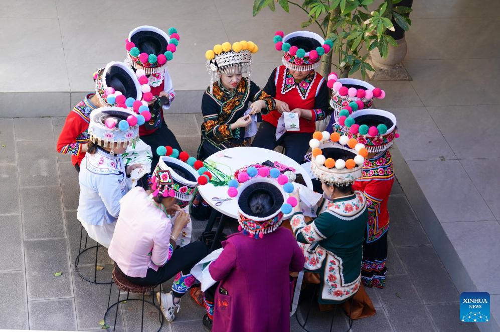 Jin Ruirui seeks suggestions from local embroiderers at her studio in Mouding County, southwest China's Yunnan Province, Feb. 9, 2026. (Xinhua/Chen Xinbo)