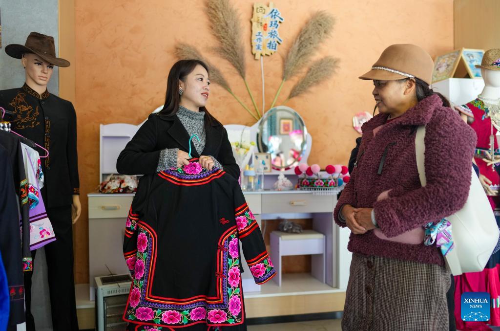 Jin Ruirui introduces Yi ethnic costumes featuring handmade embroidery to a customer at her studio in Mouding County, southwest China's Yunnan Province, Feb. 10, 2026. (Xinhua/Chen Xinbo)