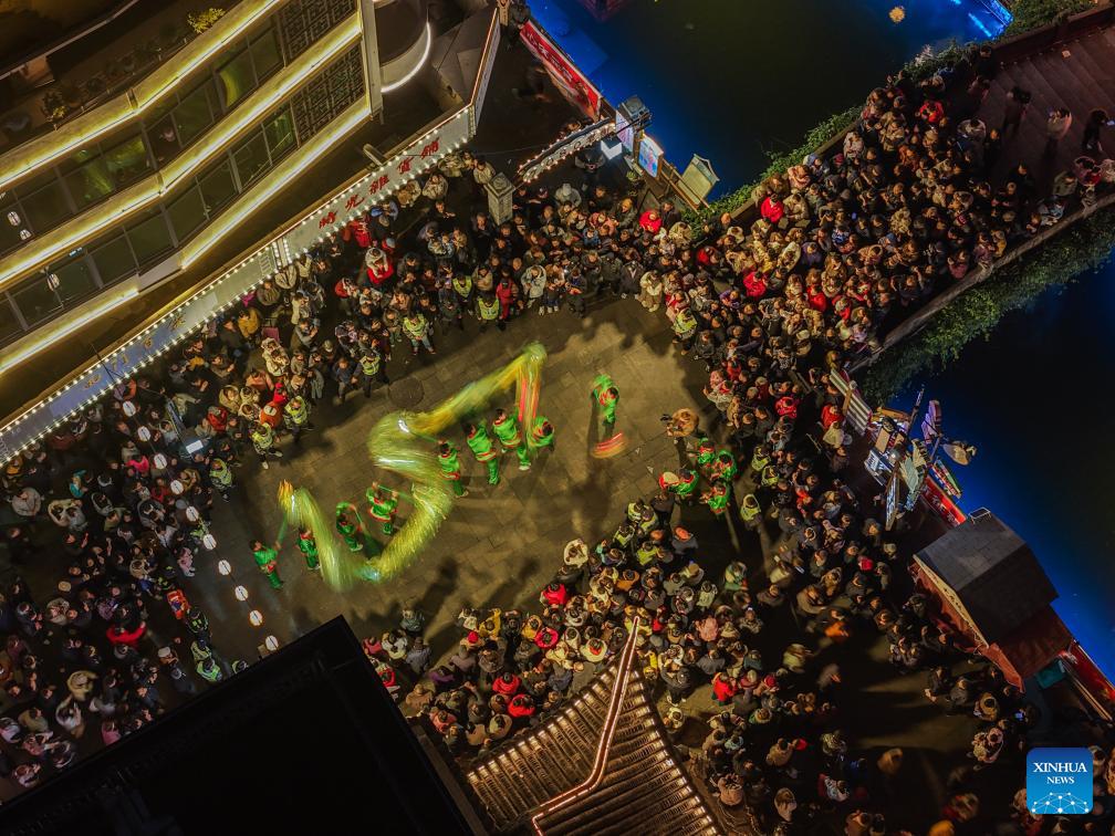 This aerial drone photo taken on March 3, 2026 shows people watching a dragon dance in celebration of the Lantern Festival in Shouchang Town, Jiande City, east China's Zhejiang Province. A Lantern Festival celebration was held here on Tuesday, attracting lots of visitors. (Xinhua/Xu Yu)