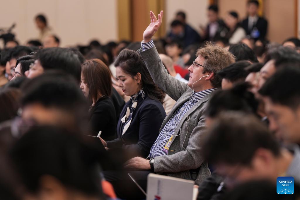Journalists raise hands to ask questions at a press conference for the fourth session of the 14th National People's Congress (NPC) on economy in Beijing, capital of China, March 6, 2026. (Xinhua/Li Xin)