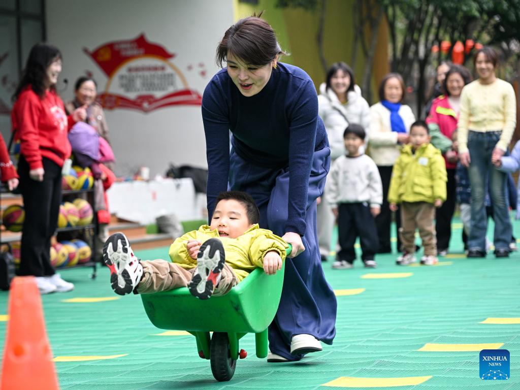 A mother participates in a fun game with her child during an activity celebrating International Women's Day at a kindergarten in Nanjing, east China's Jiangsu Province, March 6, 2026. Various events were held across China recently to mark International Women's Day. (Photo by Fang Dongxu/Xinhua)