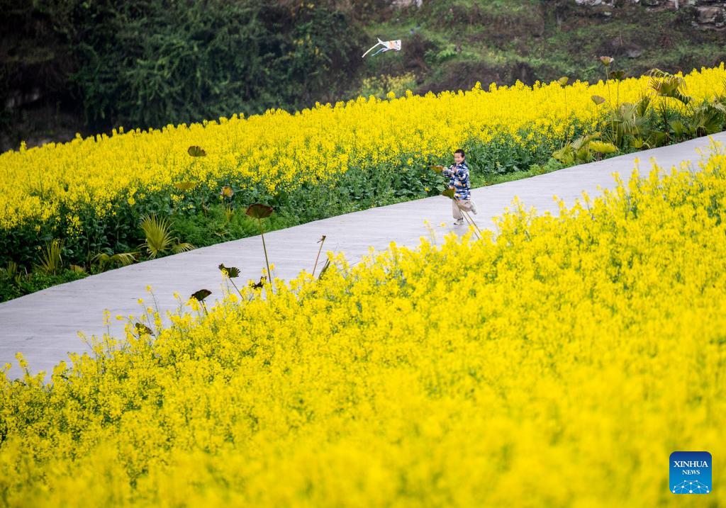 A child flies a kite in a rapeseed flower field in Xiucai Village, Shizhu Tujia Autonomous County, southwest China's Chongqing, March 7, 2026. (Xinhua/Tang Yi)