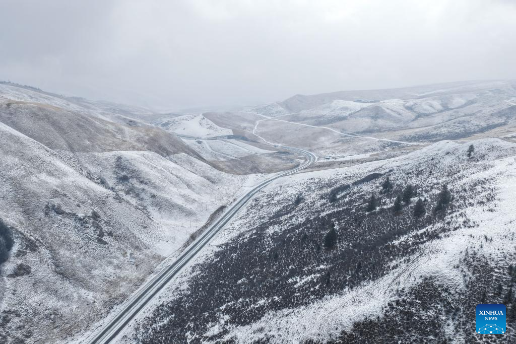 This aerial photo taken on March 8, 2026 shows snow scenery in Qilian County of Haibei Tibetan Autonomous Prefecture, northwest China's Qinghai Province. (Photo: Xinhua)