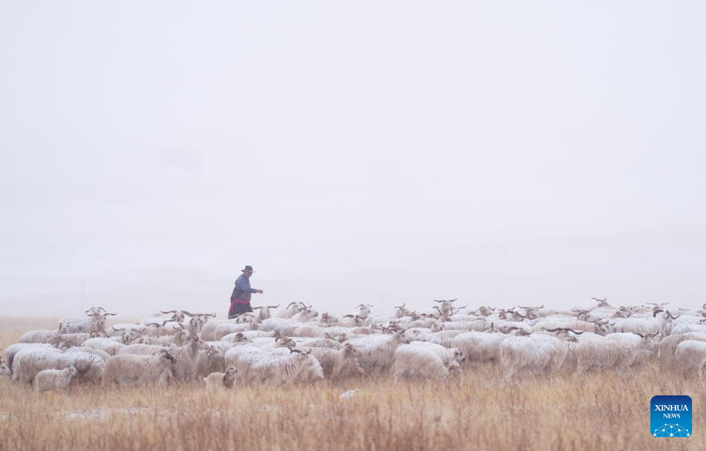 A shepherd herds livestock in the snow in Qilian County of Haibei Tibetan Autonomous Prefecture, northwest China's Qinghai Province, March 8, 2026. (Photo: Xinhua)