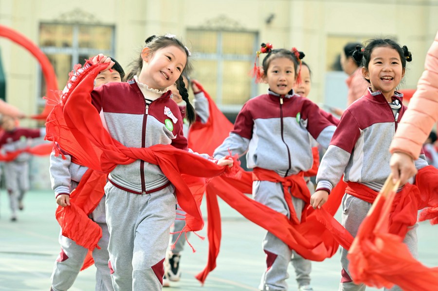 Children perform traditional Yangge dance at a kindergarten in Shijiazhuang, north China's Hebei Province, Feb. 21, 2023. (File photo: Xinhua)
