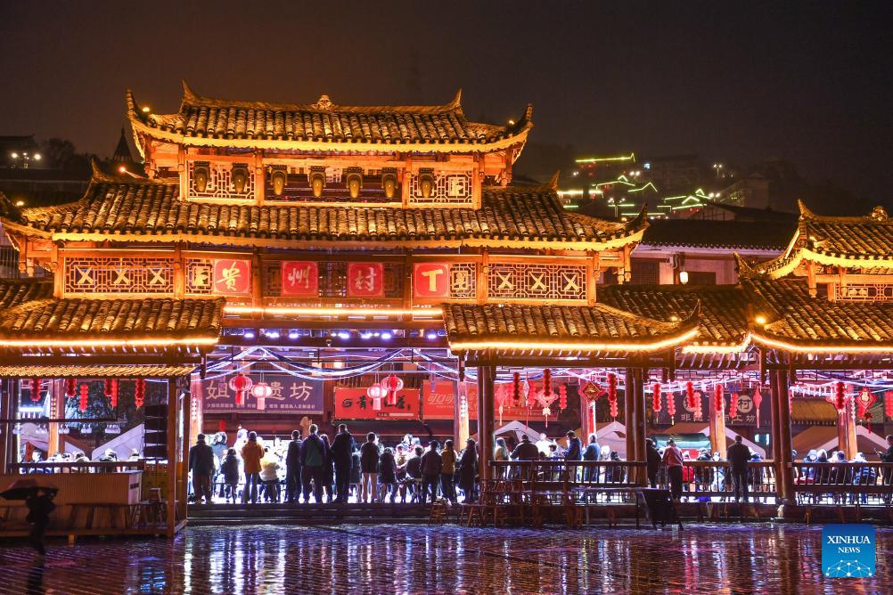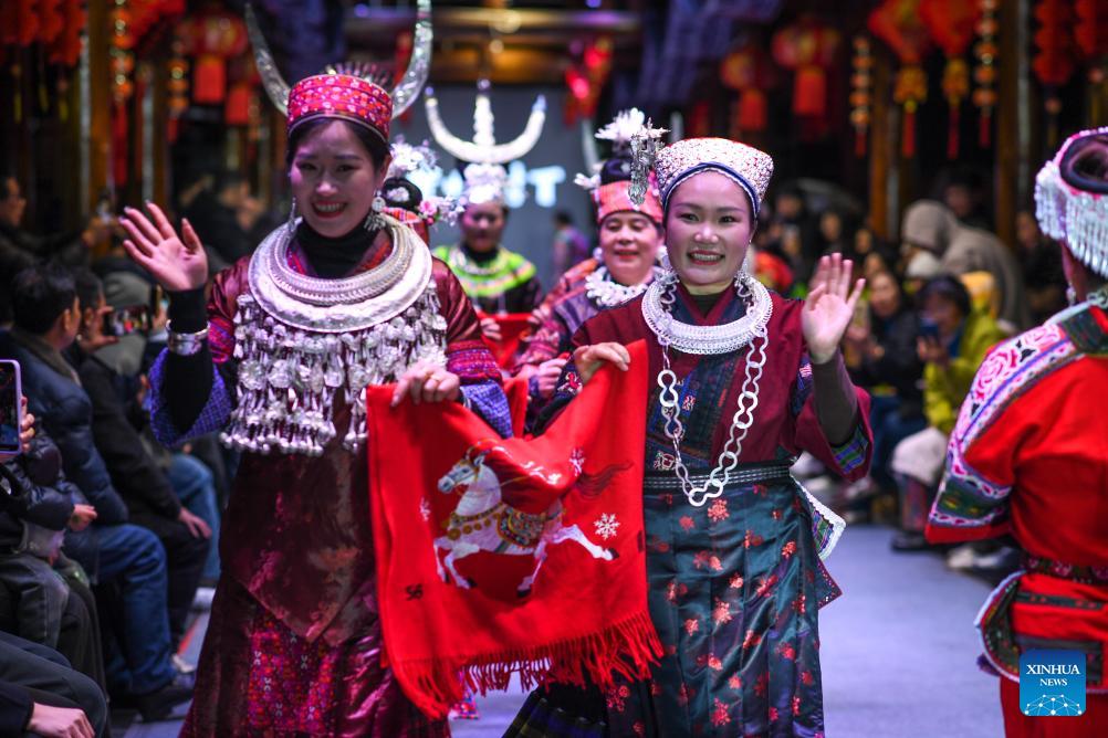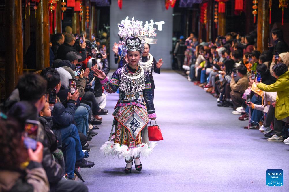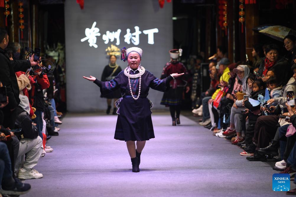 Models present traditional costumes during a "Village T" fashion show in Kaili, Qiandongnan Miao and Dong Autonomous Prefecture, southwest China's Guizhou Province, on March 8, 2026. Embroiderers from Qiandongnan Miao and Dong Autonomous Prefecture participated in the "Village T" fashion show to showcase colorful ethnic costumes. (Xinhua/Yang Wenbin)