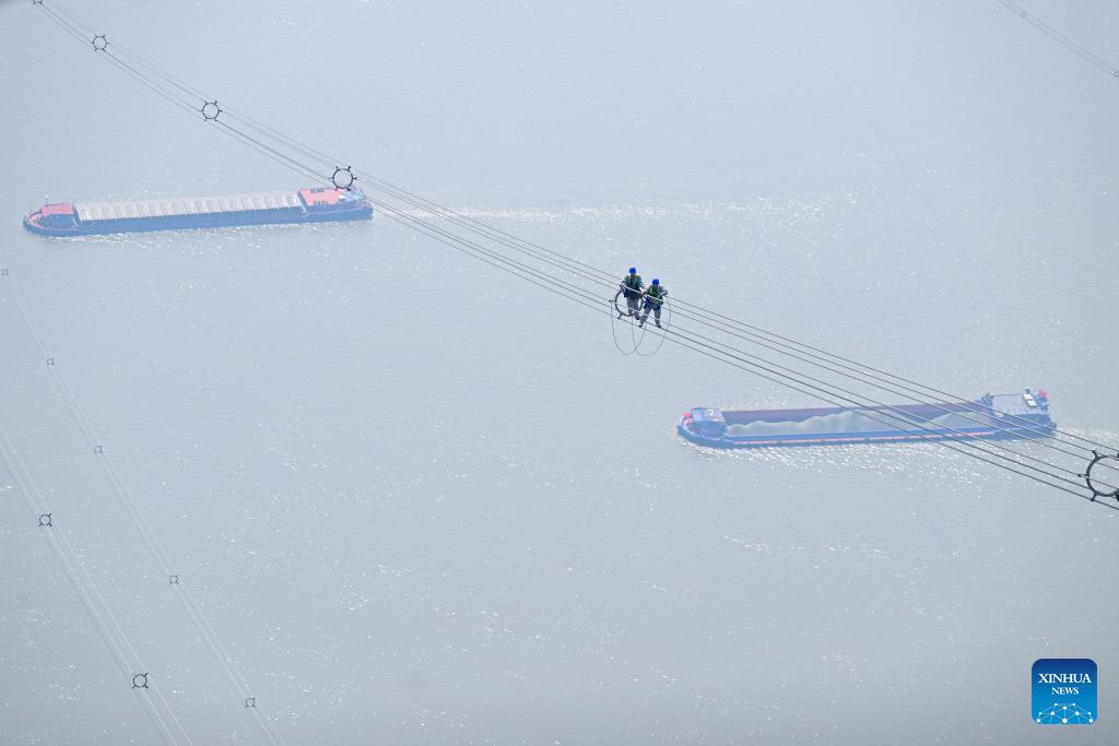 Maintenance workers check the ±800 kV ultra-high voltage (UHV) Jintang Line over the Yangtze River in Zongyang County of Tongling City, east China's Anhui Province, on March 10, 2026. (Xinhua/Zhou Mu)