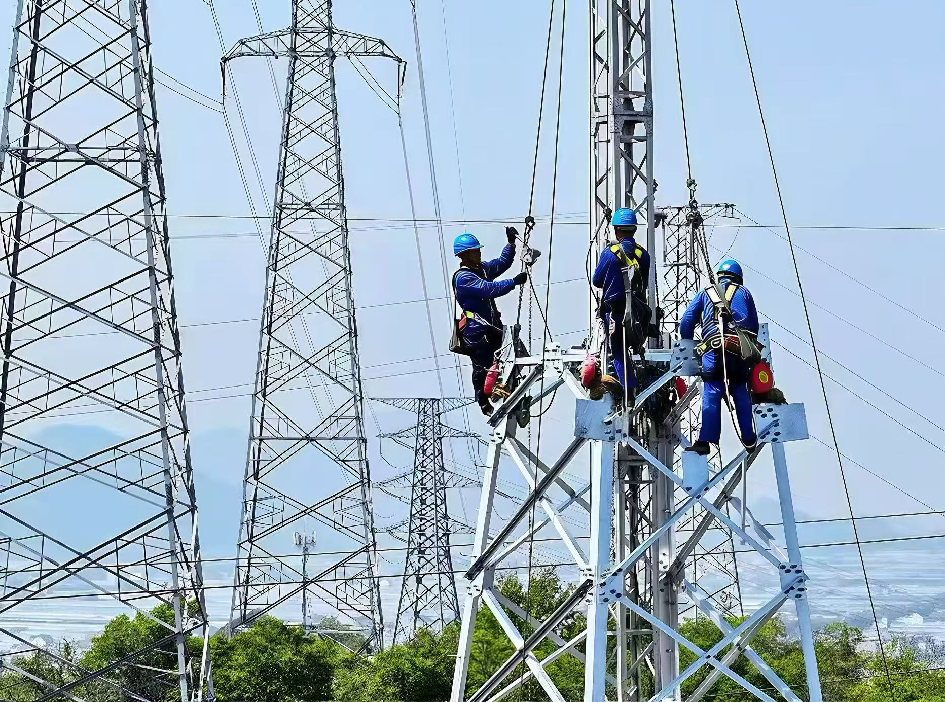 Electricity workers at the transmission tower during construction.