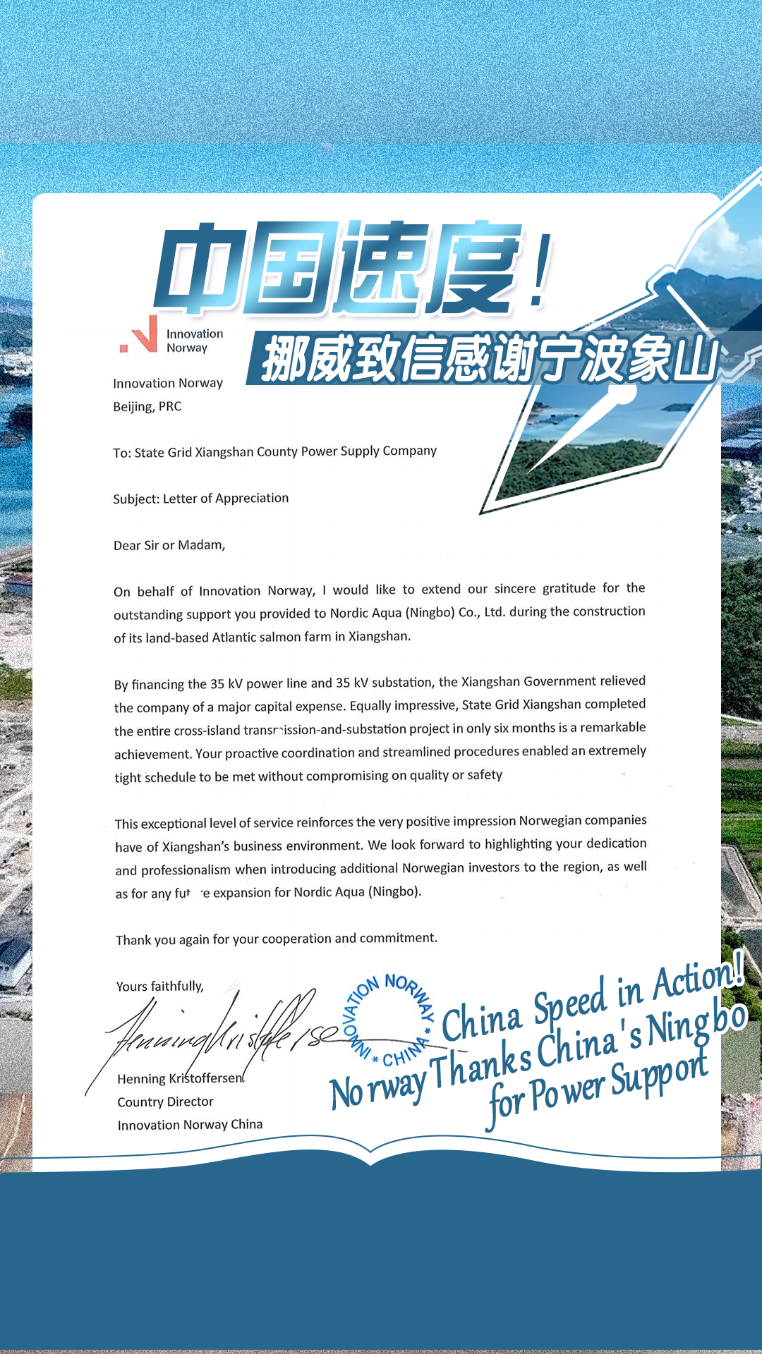 On March 11, a letter from the Innovation Norway Beijing office arrived in Xiangshan County, Ningbo, in east China's Zhejiang Province. Henning Kristoffersen, head of the agency's China office, expressed gratitude for the local support provided to Nordic Aquaculture (Ningbo) Co., Ltd., a Sino-Norwegian joint venture.