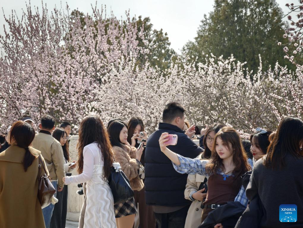 This photo taken on March 15, 2026 shows people enjoying blossoms at the Beihai Park in Beijing, capital of China. (Xinhua/Xing Guangli)