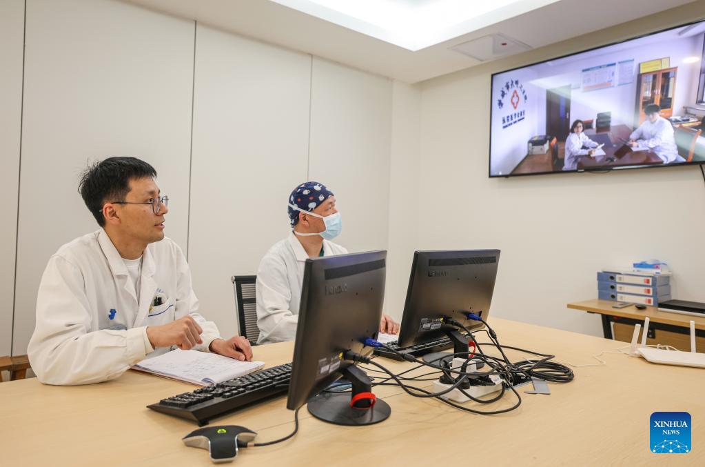 Experts of Renmin Hospital of Rongcheng City have a video conference with medical staff from a township health center to conduct remote consultations in east China's Shandong Province, March 16, 2026. Shandong Province has been striving to strengthen the foundation of medical and health service system, and enhance grassroots medical service capacity. (Photo by Li Xinjun/Xinhua)