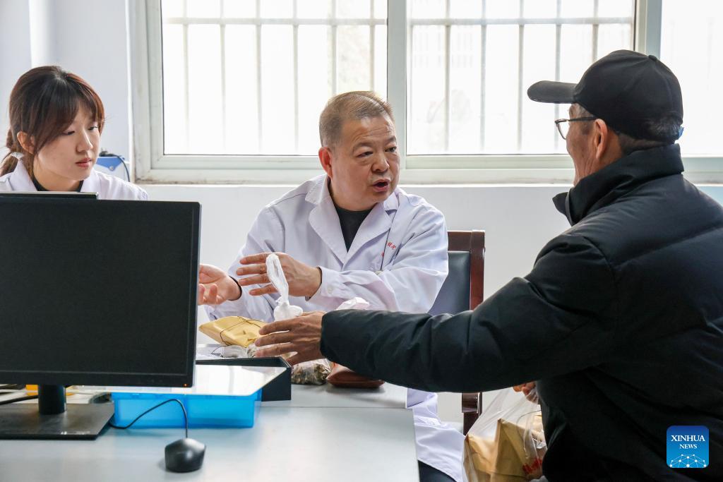 Li Zhenwen (C), a doctor from the municipal maternal and child health hospital, reminds a patient of the precautions for taking medicine at a health center in Jiangtun Town, Tengzhou City, east China's Shandong Province, March 16, 2026. Shandong Province has been striving to strengthen the foundation of medical and health service system, and enhance grassroots medical service capacity. (Photo by Song Haicun/Xinhua)