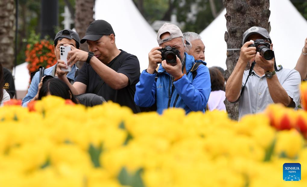 People take photos of tulips on display during the Hong Kong Flower Show in south China's Hong Kong, on March 20, 2026. The Hong Kong Flower Show kicked off on Friday, showcasing a dazzling array of blossoms, artistic floral displays, and landscaped gardens. (Xinhua/Chen Duo)
