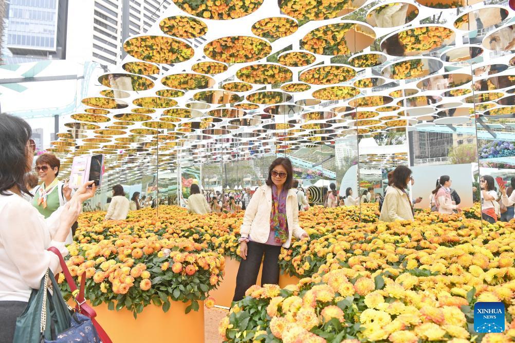 People take photos during the Hong Kong Flower Show in south China's Hong Kong, on March 20, 2026. The Hong Kong Flower Show kicked off on Friday, showcasing a dazzling array of blossoms, artistic floral displays, and landscaped gardens. (Xinhua/Chen Duo)