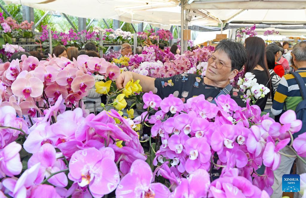 A visitor selects moth orchids on display during the Hong Kong Flower Show in south China's Hong Kong, on March 20, 2026. The Hong Kong Flower Show kicked off on Friday, showcasing a dazzling array of blossoms, artistic floral displays, and landscaped gardens. (Xinhua/Chen Duo)