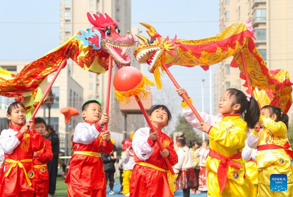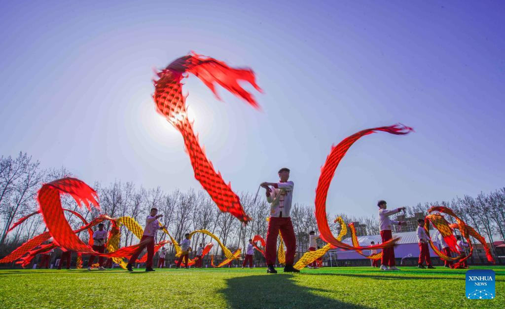 Students perform dragon dance in Yutian County, north China's Hebei Province, on March 20, 2026. The spring equinox falls on March 20. This year, it also marks Longtaitou, also known as Dragon Head-raising Day, a significant occasion in the lunar calendar, celebrated by various activities across China. (Photo by Liu Mancang/Xinhua)