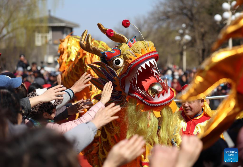 Artists stage a dragon dance performance at a park in north China's Tianjin, on March 20, 2026. The spring equinox falls on March 20. This year, it also marks Longtaitou, also known as Dragon Head-raising Day, a significant occasion in the lunar calendar, celebrated by various activities across China. (Xinhua/Sun Fanyue)